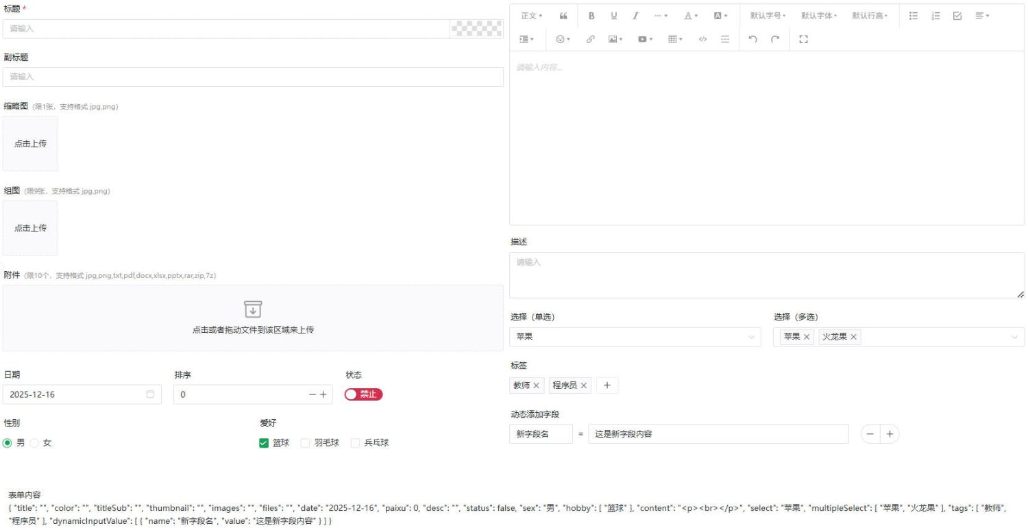 本收集的主要是表单里常用组件,包括文本框、文本毓、富文本编辑器、颜色选择、下拉单选、下拉多选、开关、单选框、多选框、日期框、数字框、动态标签框、动态文本框。如下图效果: